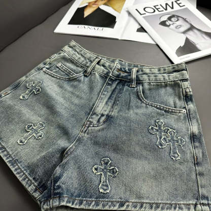 Cross patch embroidered vintage denim shorts