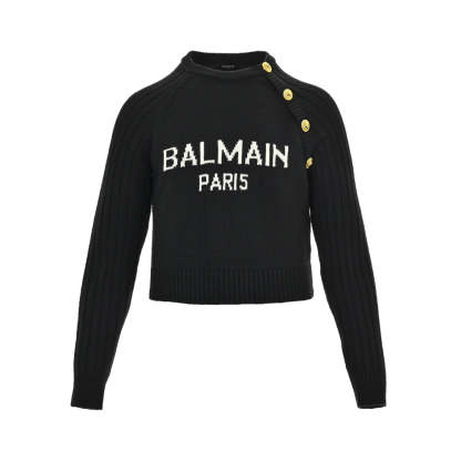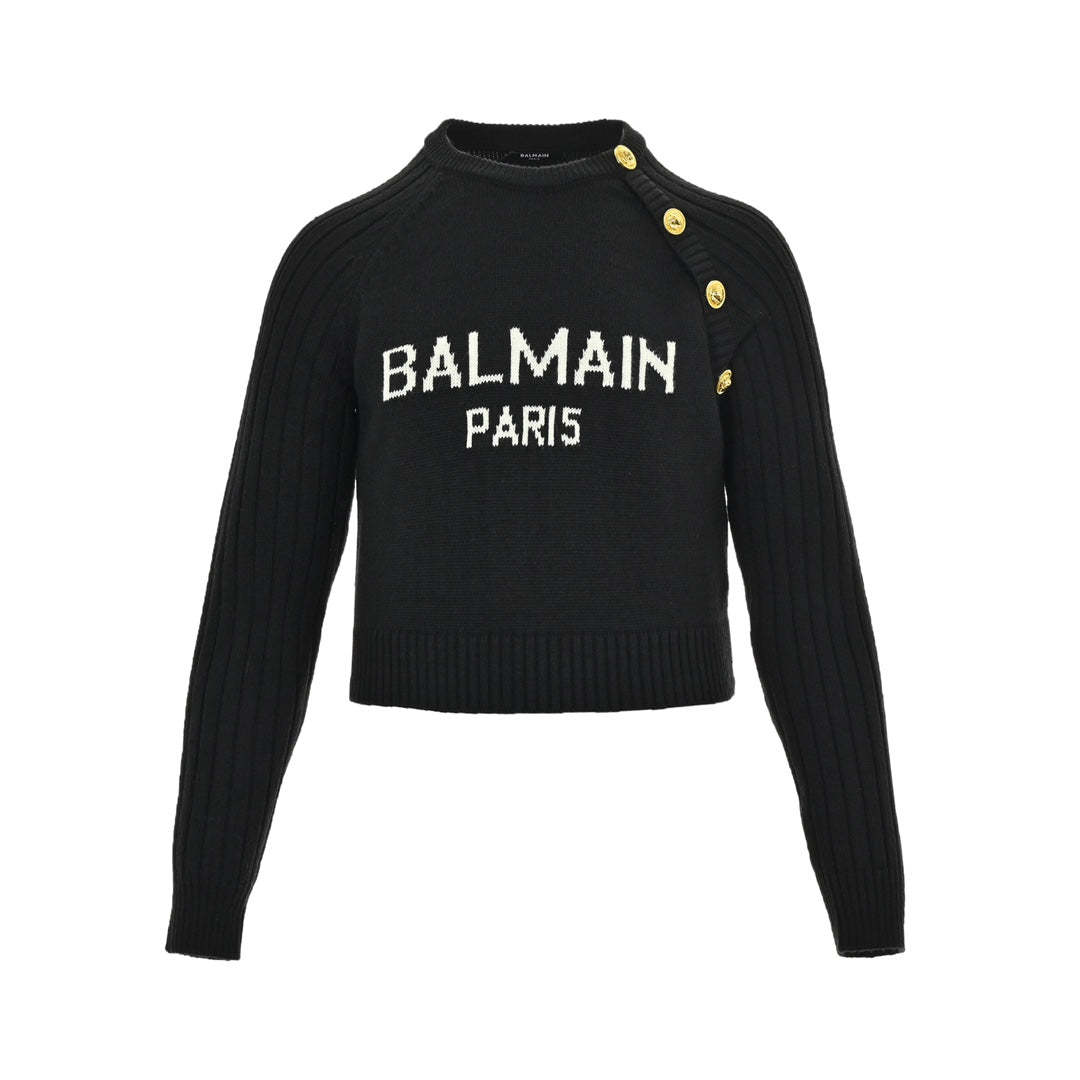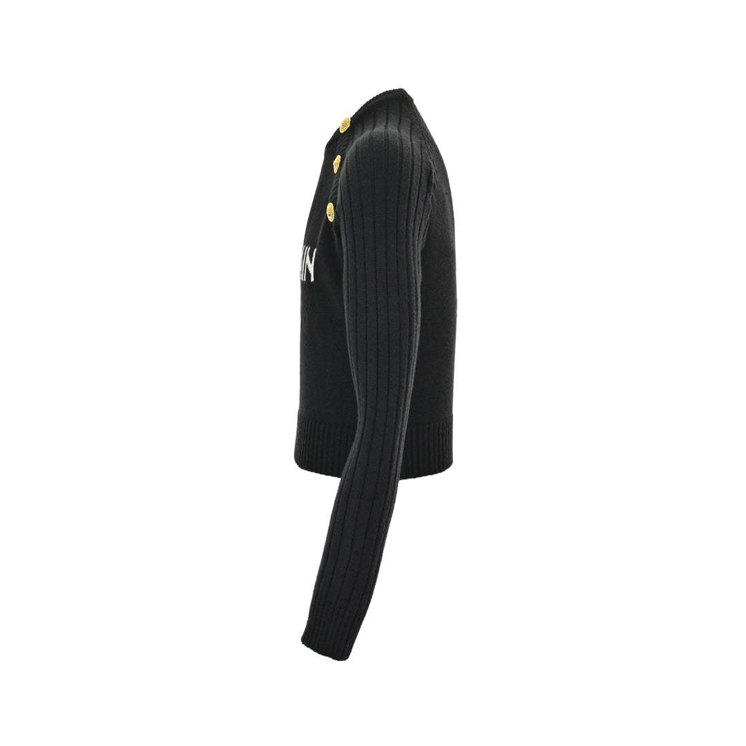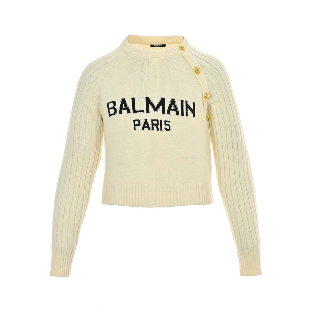 Women's letter logo metal button crew neck sweater